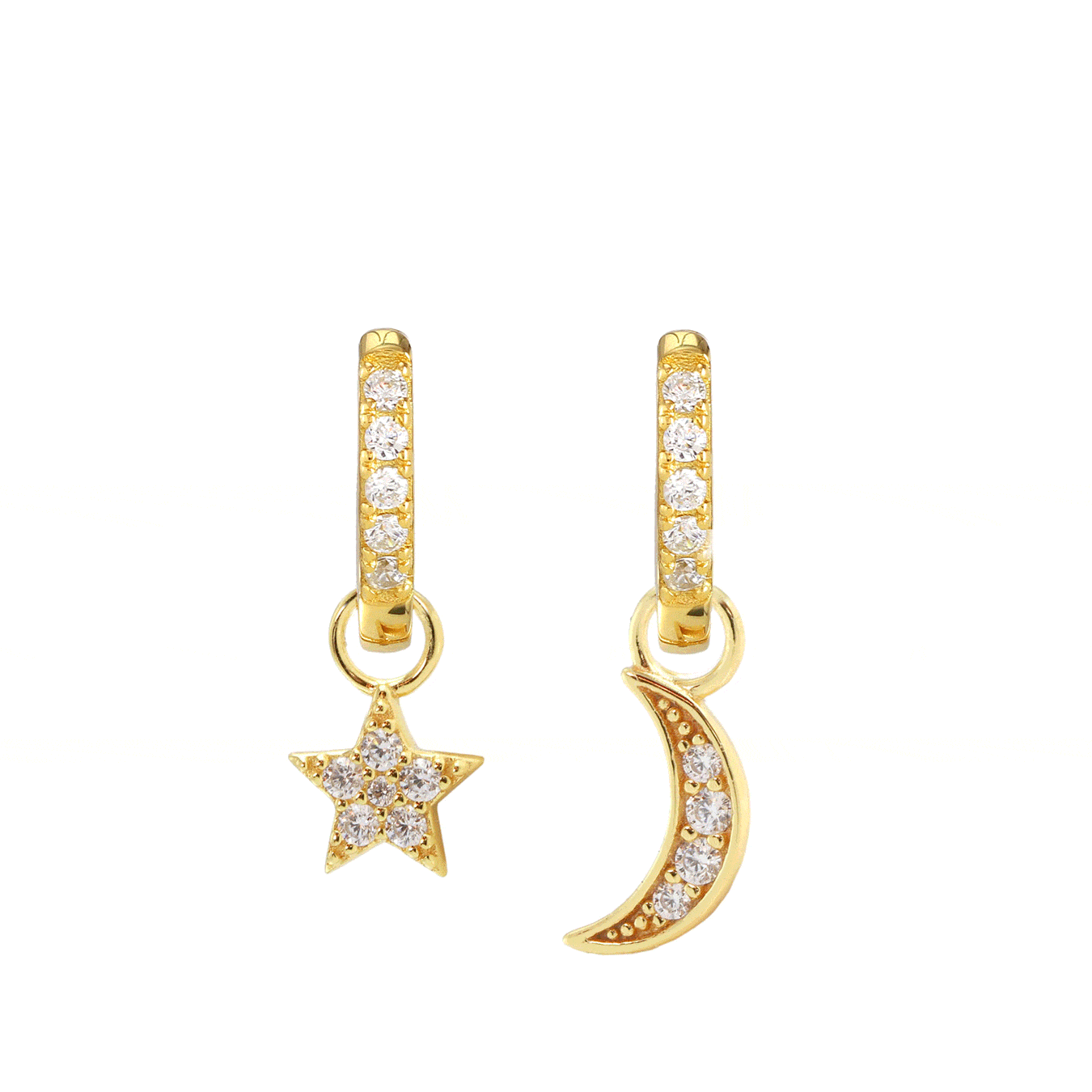 Customize your hoops with our earring charms. Designed to wear on 12mm size huggie hoops, including crystal huggie hoops, rainbow crystal huggie hoops, ruby, sapphire, emerald huggie hoops, twisted huggie hoops, and classic huggie hoops.