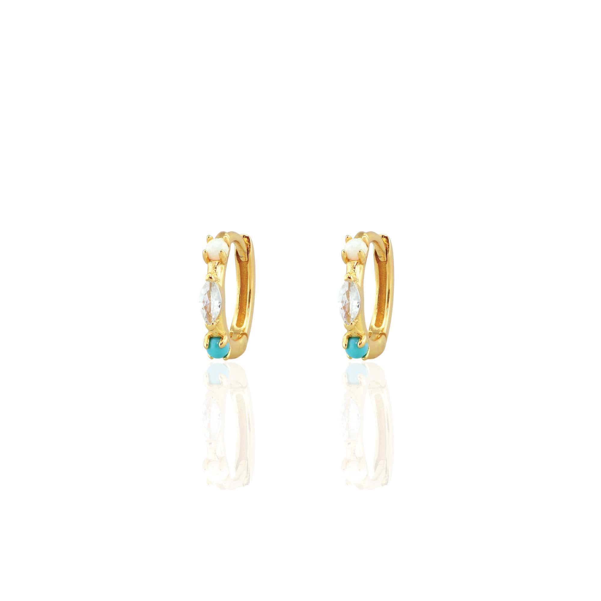 The Seaside Spark Hoops capture the essence of sunlit waves and ocean breezes. Crafted from recycled 925 sterling silver with lasting 18k gold vermeil, they feature a shimmering marquise CZ, tiny opals, and turquoise gems. Elegant yet playful, they bring a touch of coastal magic to your everyday look.
